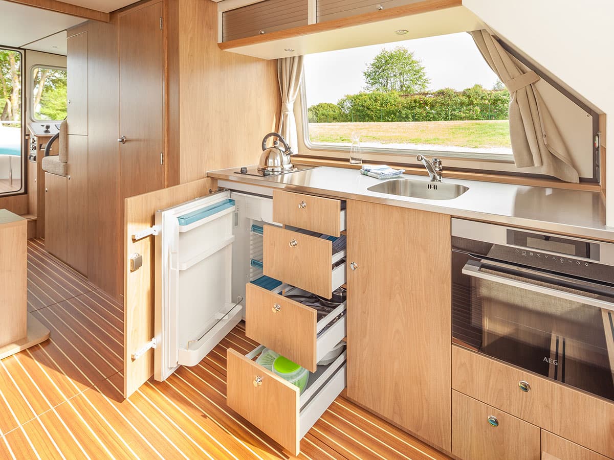Cucina con piano di lavoro in acciaio inossidabile, frigorifero (136 litri) con vano congelatore nella cambusa, una combinazione di forno a microonde/grill, un piano cottura in vetroceramica con 2 fuochi da 230V.