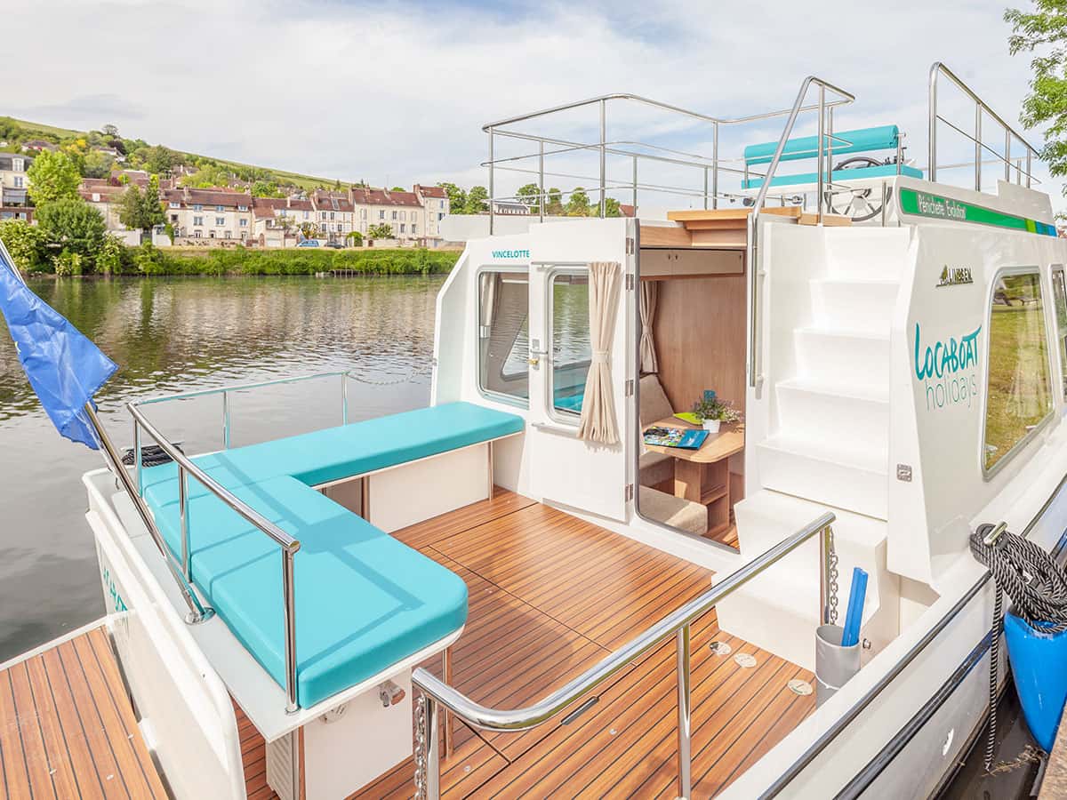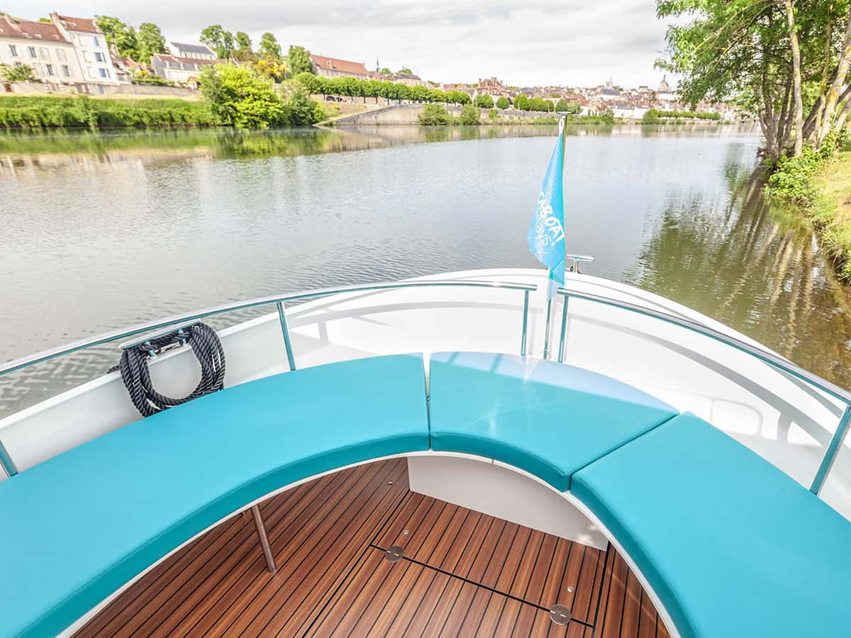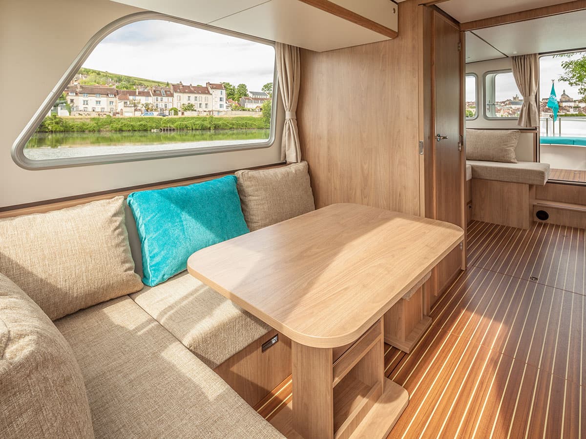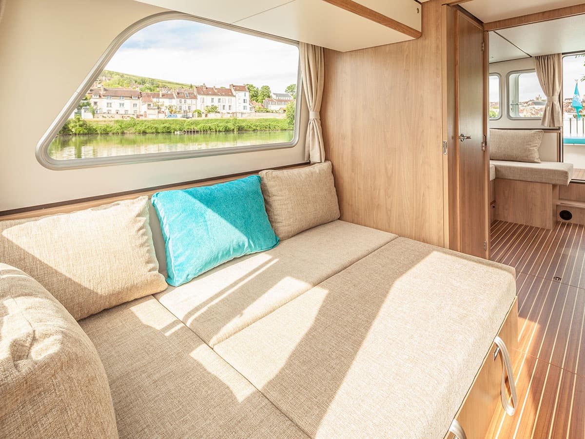 Il salone si trasforma in due cabine separate, ognuna con un letto matrimoniale (135×200 cm) e spazi per riporre i bagagli. Esternamente sono presenti 3 terrazze una a prua, una a poppa e una sul ponte superiore con seconda postazione di guida, per vivere al meglio delle vacanze fluviali all’aria aperta.