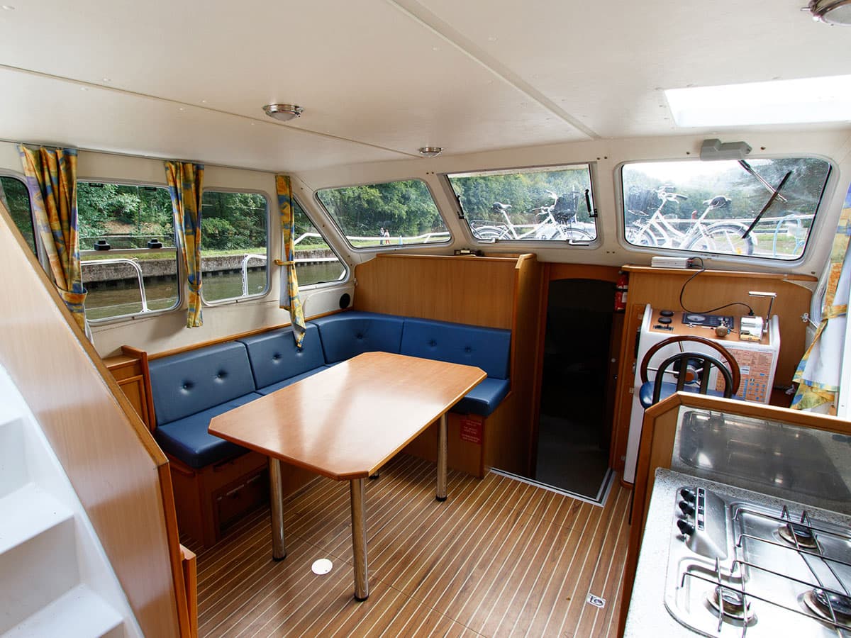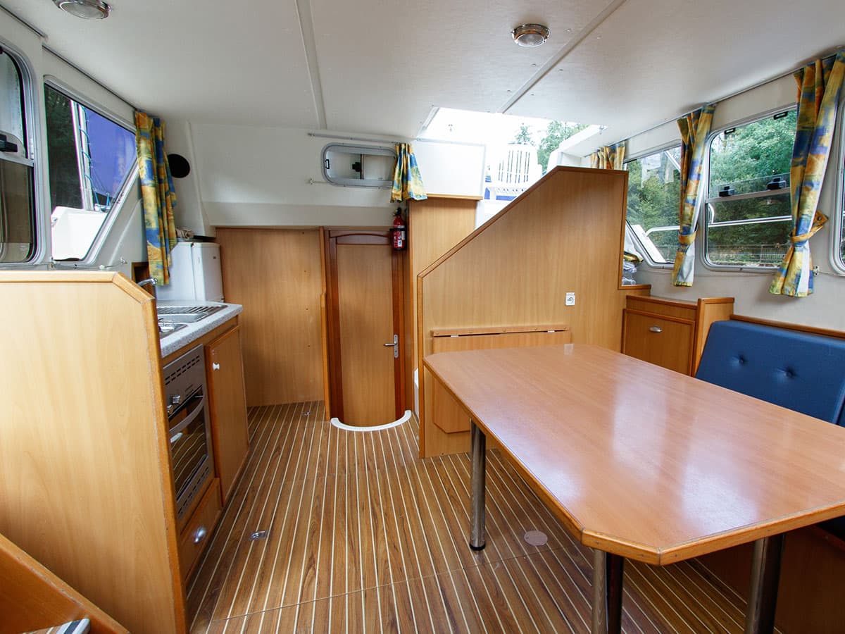La barca Tarpon 32 dispone di ponte superiore attrezzato con doppia postazione di pilotaggio a cui si accede attrevarso una scala interna posta nel salone. Modello economico ideale per una vacanza fluviale in due coppie o in famiglia con bambini.