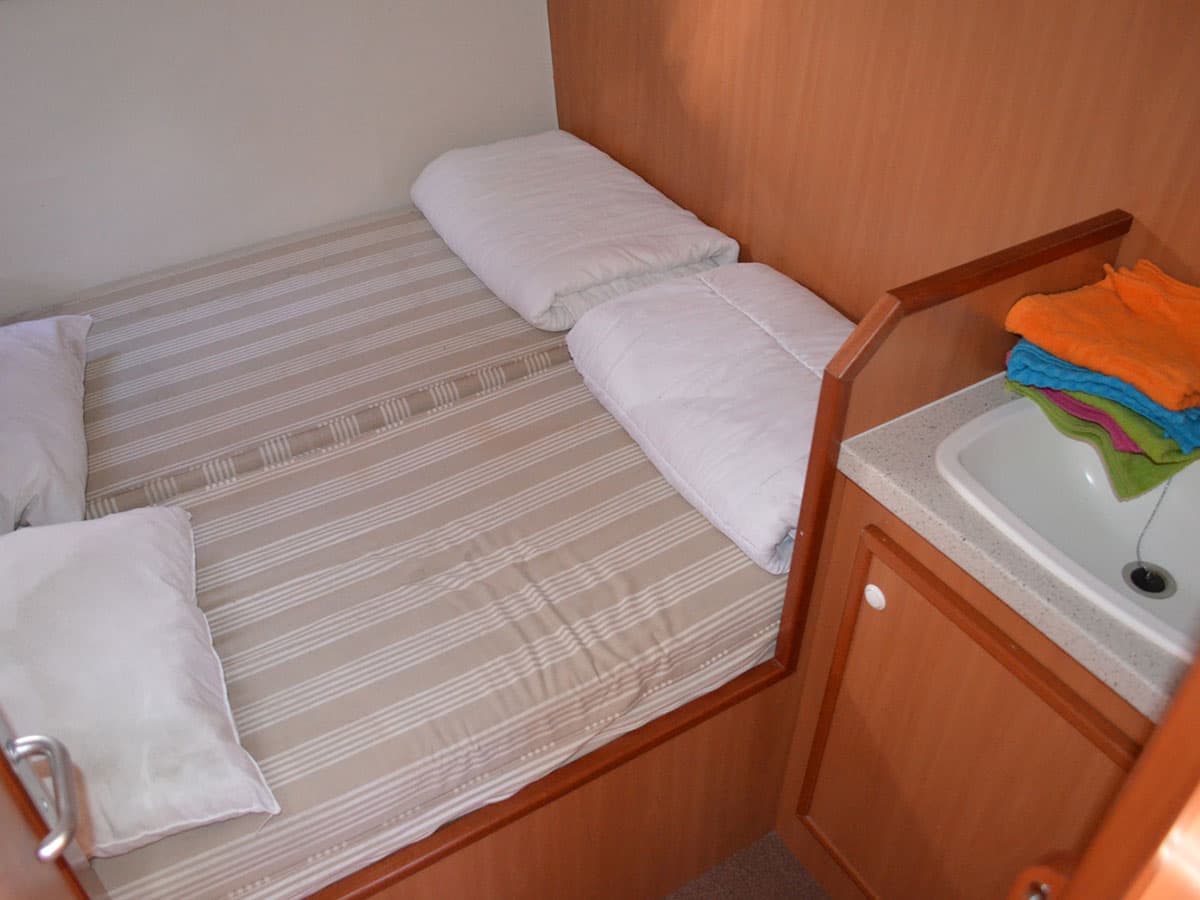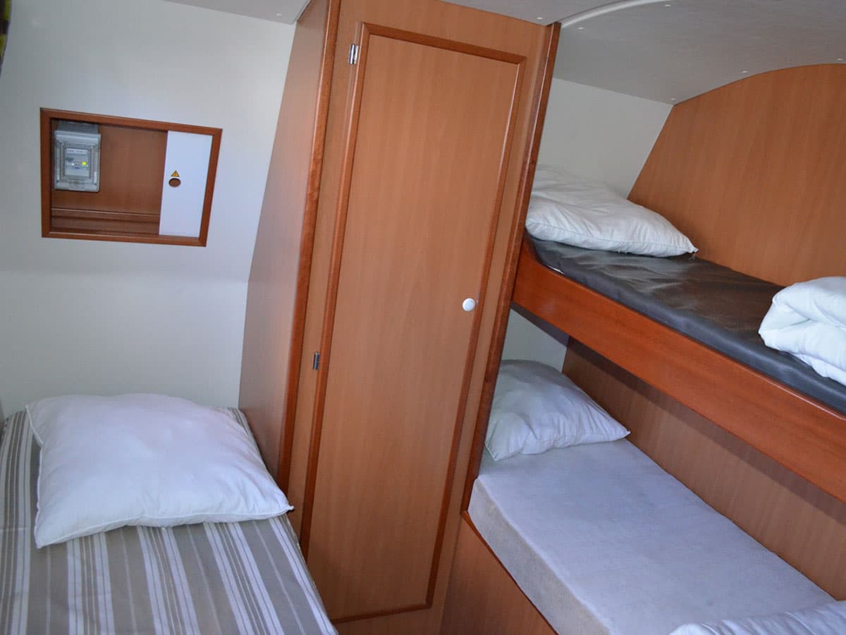 4 cabine: una tripla a prua con letto matrimoniale e letto singolo, due a poppa di cui una con letto matrimoniale e una con letti a castello e letto singolo e una centrale matrimoniale
