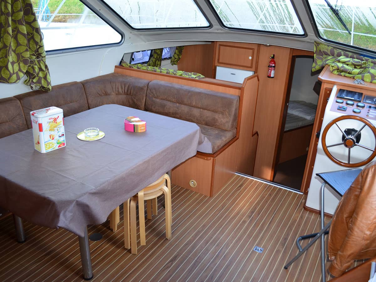 Salone con divano angolare trasformabile in letto, postazione di pilotaggio, entrata laterale e scala interna per il ponte superiore