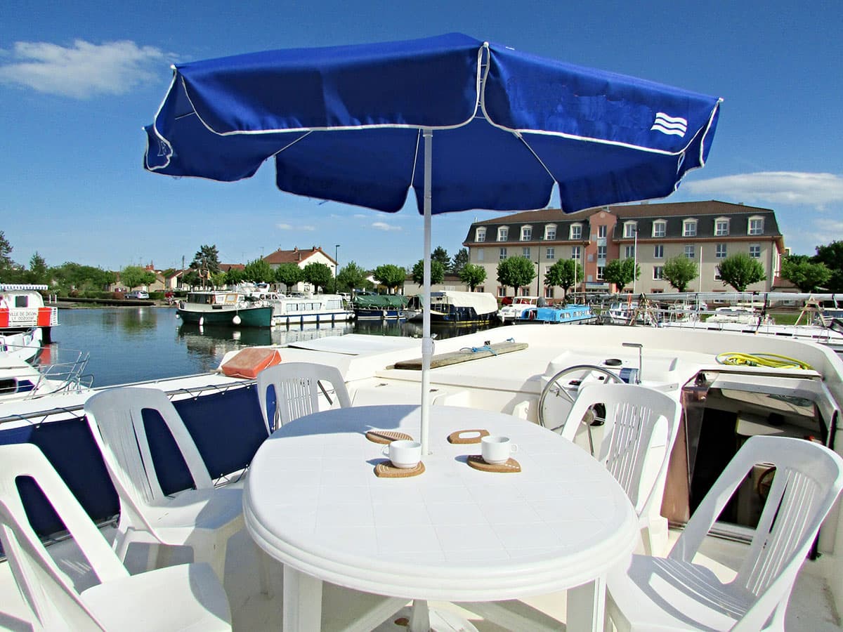 La Tarpon 42 dispone di ponte superiore attrezzato con tavolo, sedie e doppia postazione di pilotaggio a cui si accede attrevarso una scala interna posta nel salone. Ideale per una crociera fluviale in più famiglie con bambini o per 3 coppie.